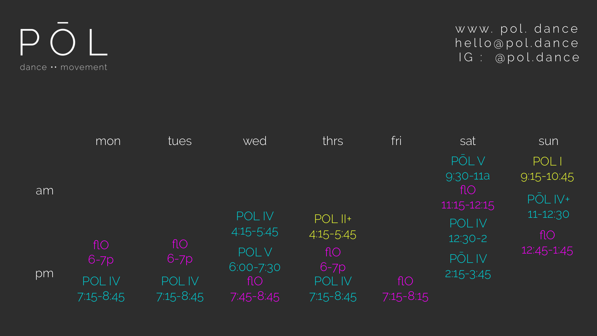 POL IV & V are our intermediate & advanced level pole classes. These classes are by ongoing membership. Pls inquire for placement & registration.